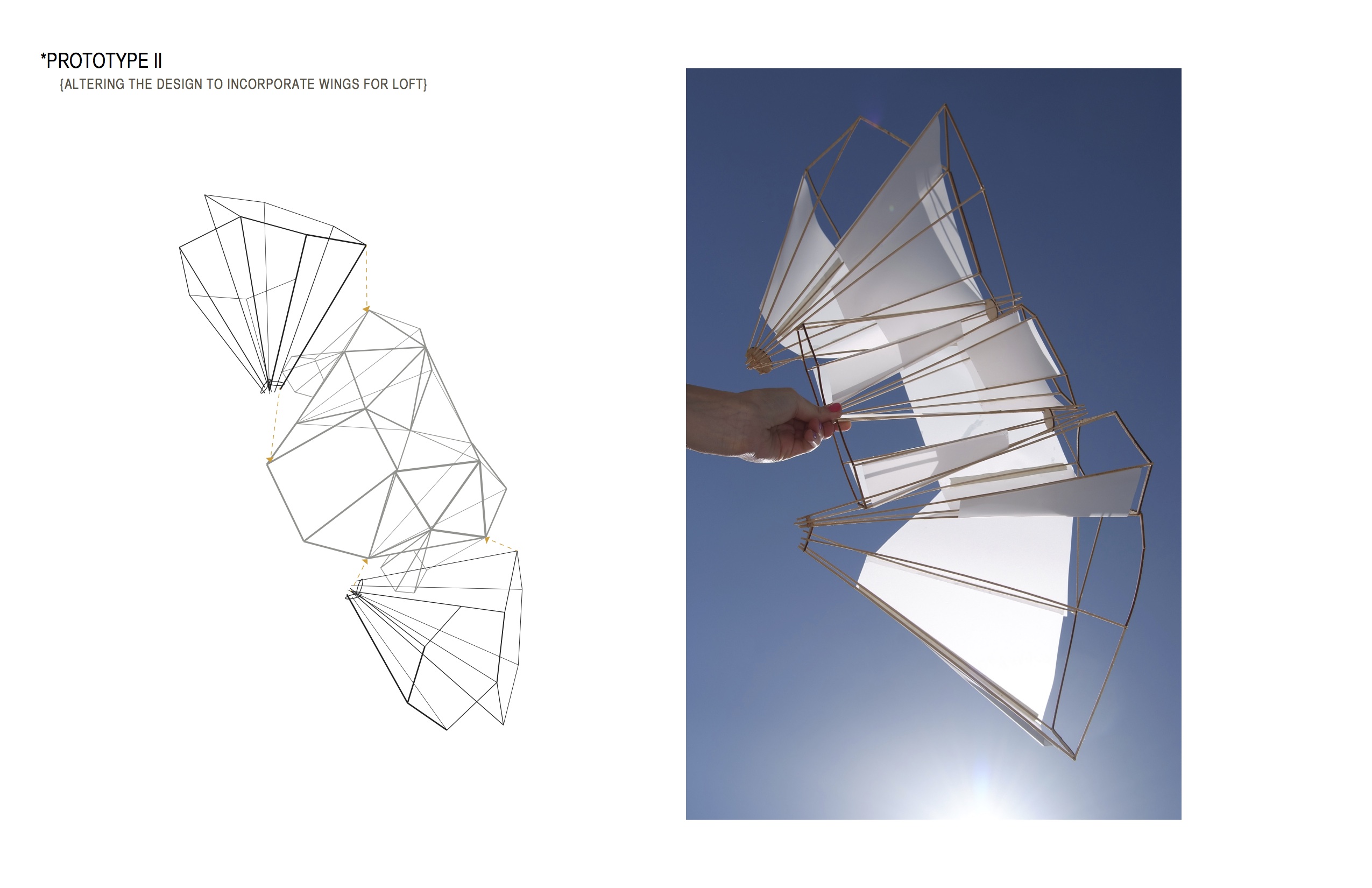 The Hexocone Kite was designed through a series of prototype tests. As the form evolved, the basic design remained the same: to construct the kite from hexagonal modules. The final kite is made up of cones extruded from hexagons of varyings shapes and sizes, faning out in a wing-like form to catch wind.