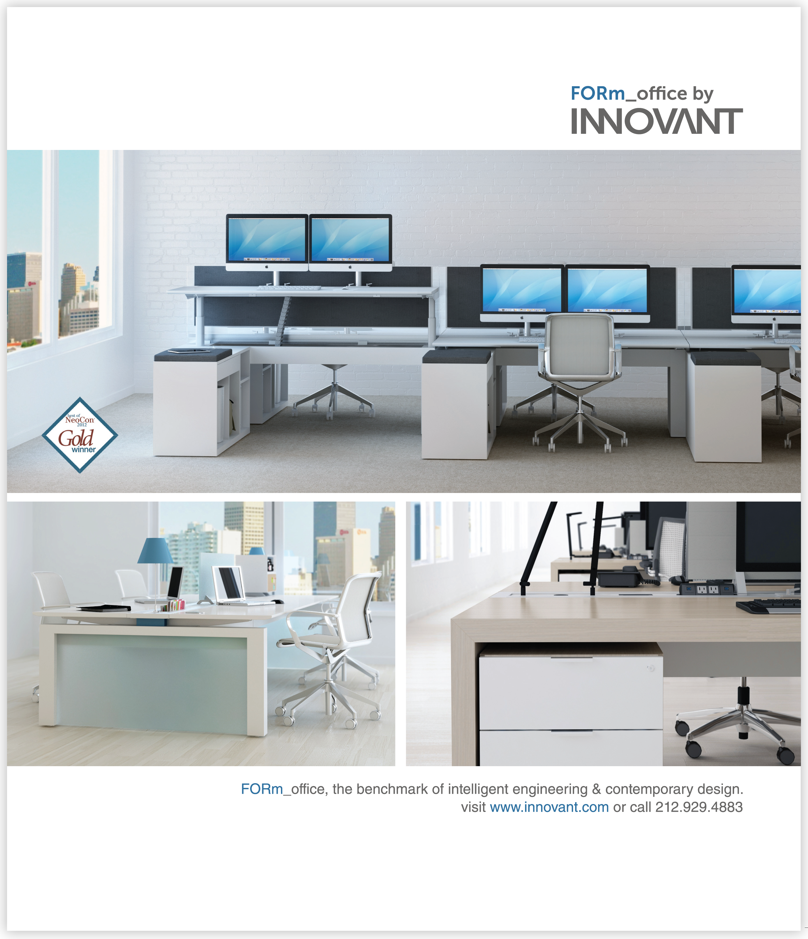 Innovant is an office furniture industry leader, manufacturing workstations, private offices and conference products for some of the world's most prestigious and progressive clients. The updated branding reflects Innovant’s material palette and robust product designs. Art direction provided to multimedia artists who executed the digital renderings below. Visit Innovant’s website to view collateral library.